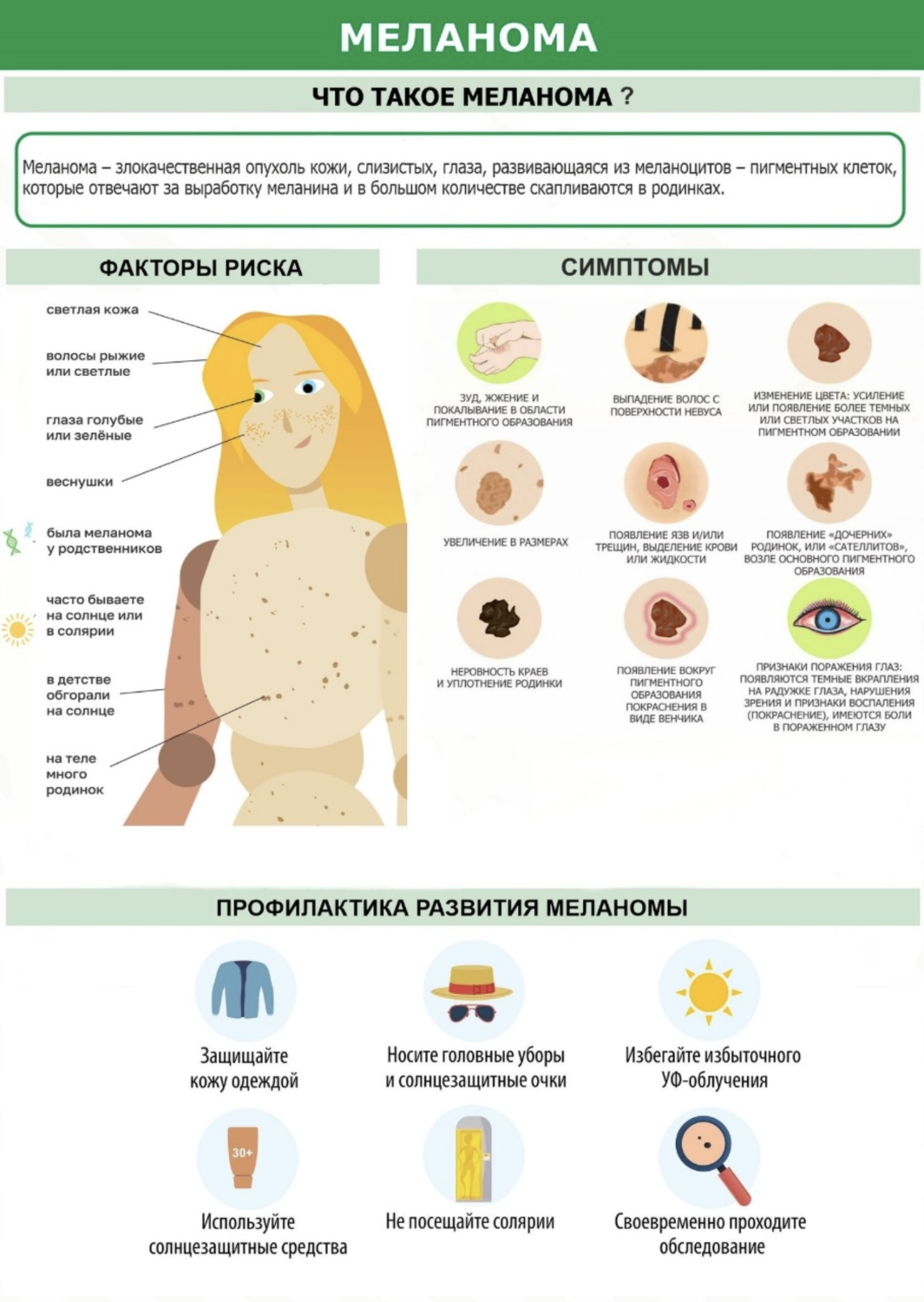 Считается, что примерно 33% случаев рака кожи можно предотвратить с помощью профилактики и самоконтроля – это действительно немало! В период наибольшей солнечной активности защищайте себя от ожогов, используя солнцезащитные кремы, одежду с длинным рукавом, шляпы с полями и темные очки. Регулярно осматривайте свои кожные покровы и просите близких проверить там, где вам сложно рассмотреть. Если появилось новое образование на коже, какая-то из родинок выглядит необычно или начала меняться, зудеть, кровоточить – немедленно обратитесь к врачу. Но даже если вы не замечаете тревожных признаков, регулярно проходите осмотр в рамках диспансеризации в своей поликлинике – так вы будете максимально уверены в своем здоровье.